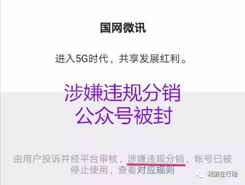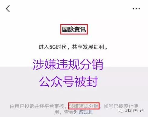 至于说国脉公司要整合三大巨头,只能是一厢情愿而已,一个注册资金1000万的私企公司,凭什么去整合财大气粗的三大巨头国企公司,并且是上市公司,国家管控的公司,蛇吞象的故事只是传说!这些与国脉有关公众号被封,可不是空穴来风!腾讯公司封号理由:涉嫌违规分销