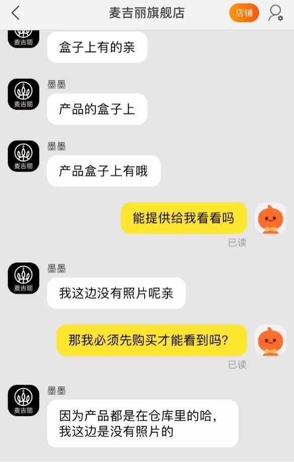 在淘宝麦吉丽旗舰店中找到该款产品,在其详情页也无法找到有关产品的生产许可证信息。询问淘宝麦吉丽旗舰店客服,称在产品盒子上有,但产品在仓库,无法提供。