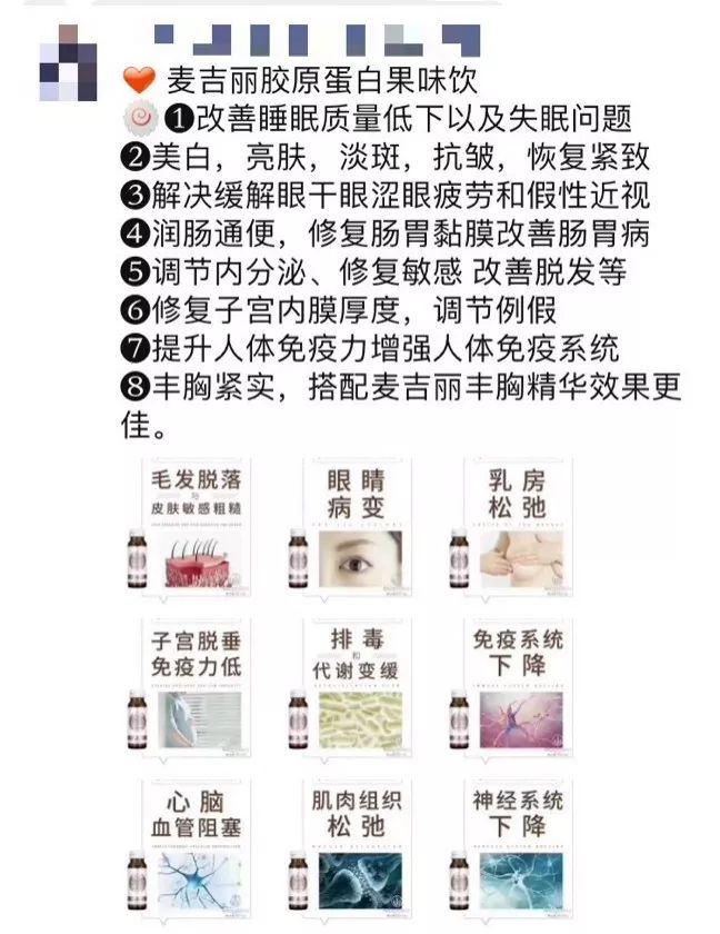除此之外麦吉丽的微商代理们再宣传时更是什么夸张用什么:“抑制黑色素”、“改善睡眠”“美白”……