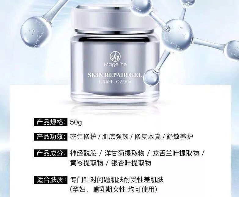 在微商代理们的朋友圈里,“麦吉丽基因修复啫喱具去湿热、镇定舒缓、抗炎防敏提升肌肤修护能力,连宝宝烫伤过敏湿疹,蚊虫叮咬都可以用”、“麦吉丽贵妇美颜膏一个月见自然白,去黄、去痘印、祛斑、紧致皮肤”这样的文案比比皆是。