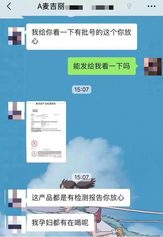 还有一款售价360元的“麦吉丽胶原蛋白果味饮”被微商代理宣传为具有美白、抗皱、改善睡眠、改善脱发、丰胸等多种功效,但当问及该产品的食品生产许可证时,该微商代理称产品有检测报告(第三方)且孕妇都有在食用,他进一步解释,“因为我们这个是进口的材料国内生产的,所以就是直接由生产日期数字作为生产的批号的”。