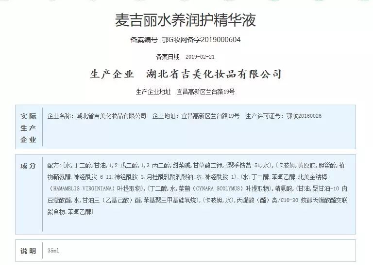 此外,其“水养润护柔肤水”、“水养润护精华液”两款产品的产品成分描述也存在与备案不符的情况,如其宣称“水养润护精华液”中含有的积雪草提取物、蜗牛提取物、库拉索芦荟等成分在备案中均不存在。