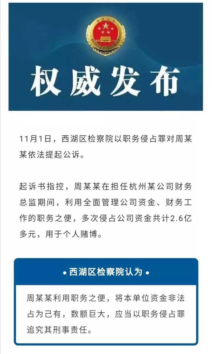 网传该公司财务负责人周某某卷款2.6亿事件,小时新闻记者从“西湖检察”官方微信也查到了这起案件。