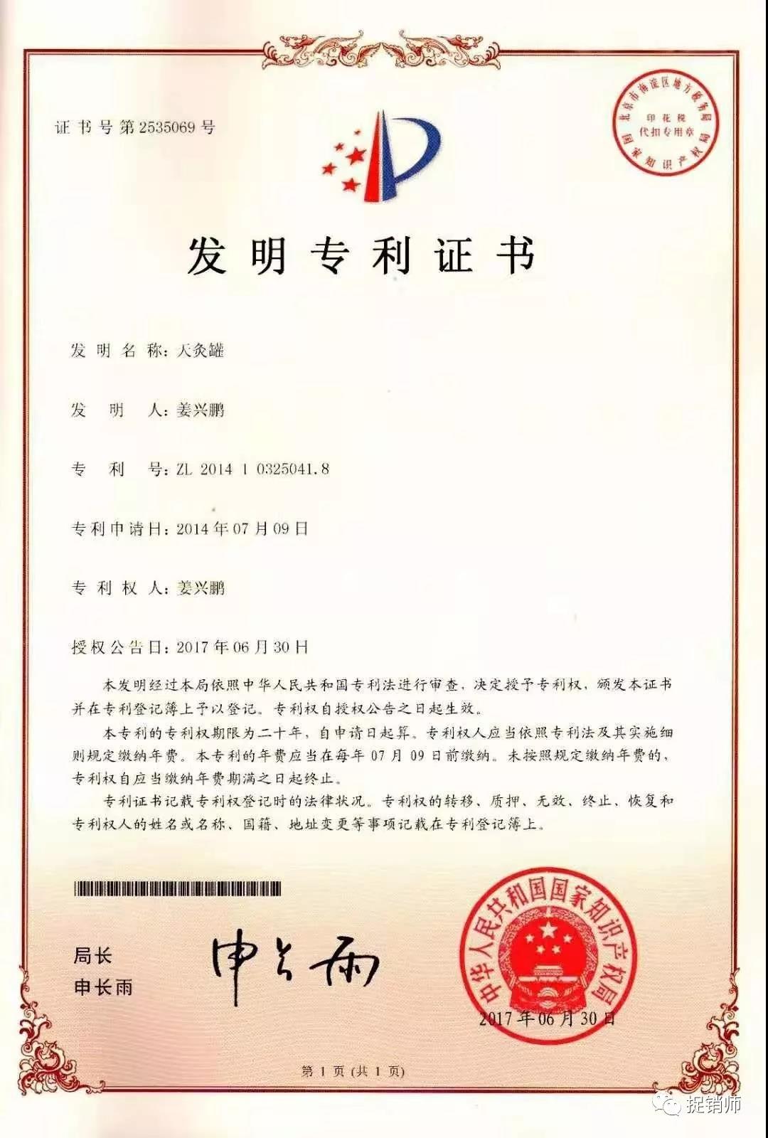 发明名称为“天灸罐”的发明专利证书,发明人姜兴鹏(图片来源于康源达公众号)