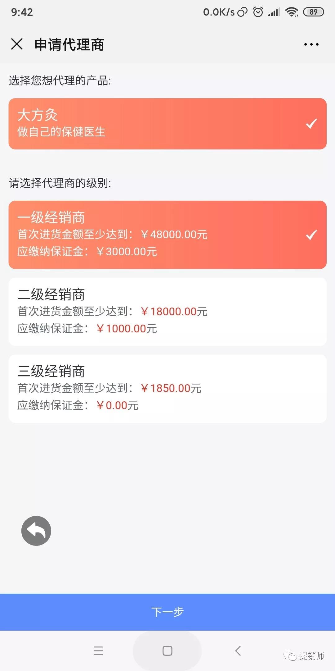 一级代理商(联合创始人):首次进货额48000元,保证金3000元;