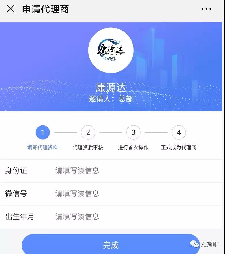 当笔者进入康源达公众号在点击申请代理商后,页面如下: