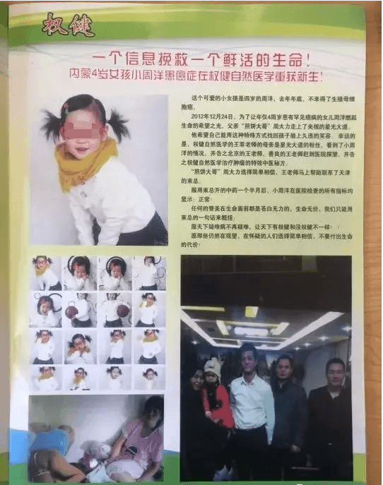 周二力:找过,2013年5月份左右,我还去找过他们,但他们没有见我,加上孩子当时病得比较重,也没顾得上。大概在2013年11月份,在一个权健的经销商宣传册上,看到一篇名为《内蒙4岁女孩小周洋患癌症在权健自然医学重获新生》的文章,我很生气,那是2013年年初,我们一家受邀到权健的创始人束昱辉的办公室的一张合影。没想到照片被用到了虚假宣传上,还留了我的电话。之后连续好几年,都有电话打来问我的女儿是不是被权健的药治愈了。
