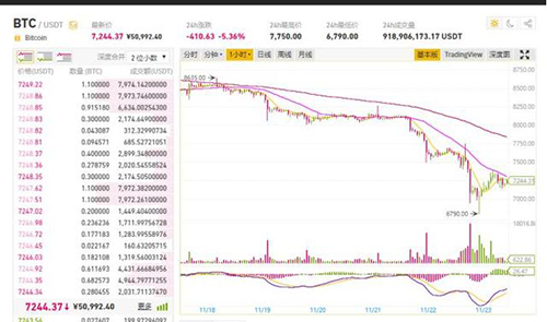 在过去24小时,数字货币上演集体暴跌。币安行情软件显示,比特币最低跌至6790美元,为6个月来最低水平,截至记者发稿,比特币价格报7244美元,24小时内跌410.63美元,即一枚比特币就蒸发了人民币2874元。