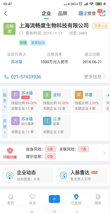 据了解,流畅度生物成立于2016年6月,法人苏某某,注册资本1000万元,实缴0元。