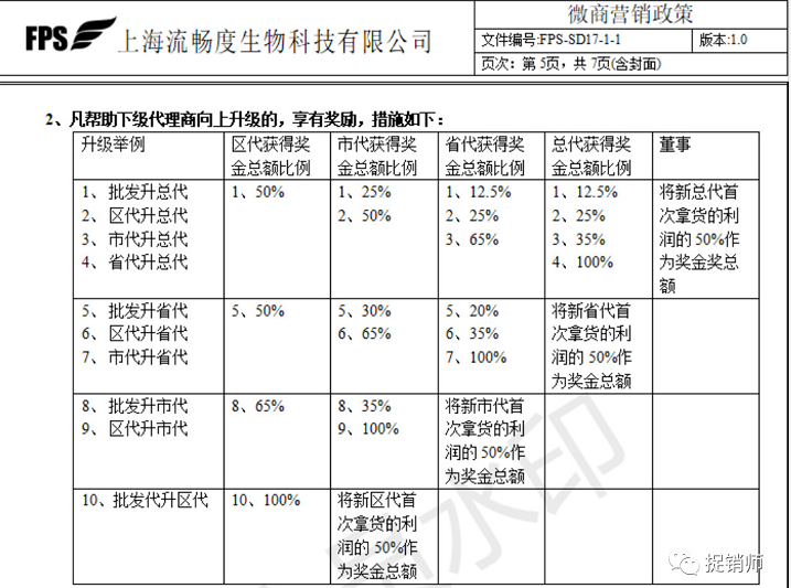 1、总代招一位新升级总代的平级奖励。举例:B总代招了C总代,平级拿货价一样,B总代上级董事需把C总代首次拿货利润的50%分给B总代,之后,B总代上级董事需把C总代每月拿货利润的40%分给B总代。