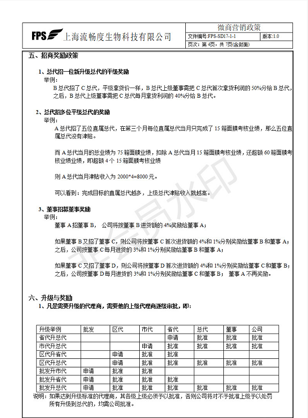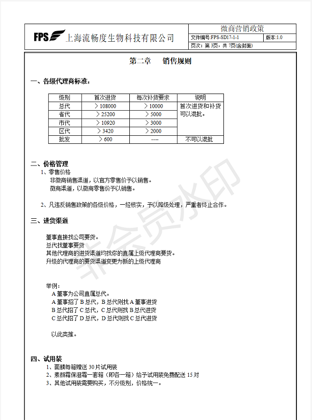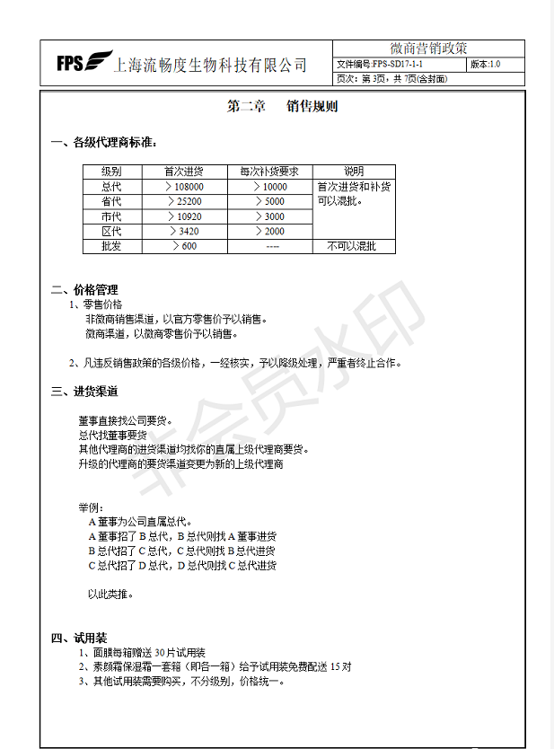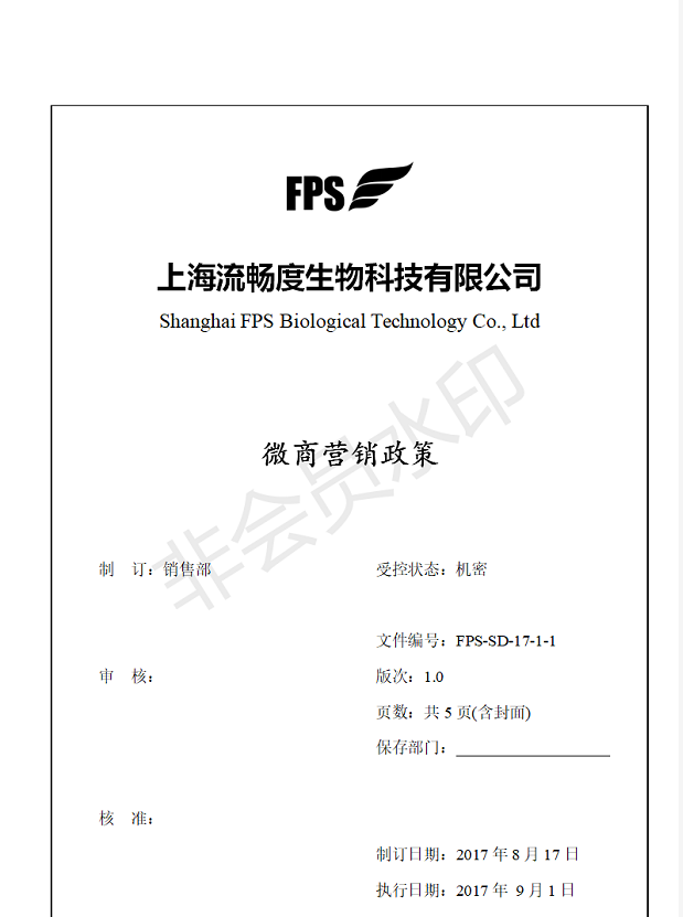 这是一份由流畅度生物销售部门制定的受控状态为机密的微商销售政策。