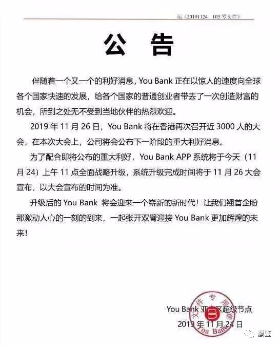 鹰鉴了解到,11月24日,“YouBank亚洲区超级节点”发布了一份公告。该公告称,“11月26日,You Bank将在香港召开近3000人的大会,在本次大会上,公司将会公布下阶段的重大利好消息。为了配合即将公布的重大利好,You Bank APP系统将于今天上午11点全面战略升级。”