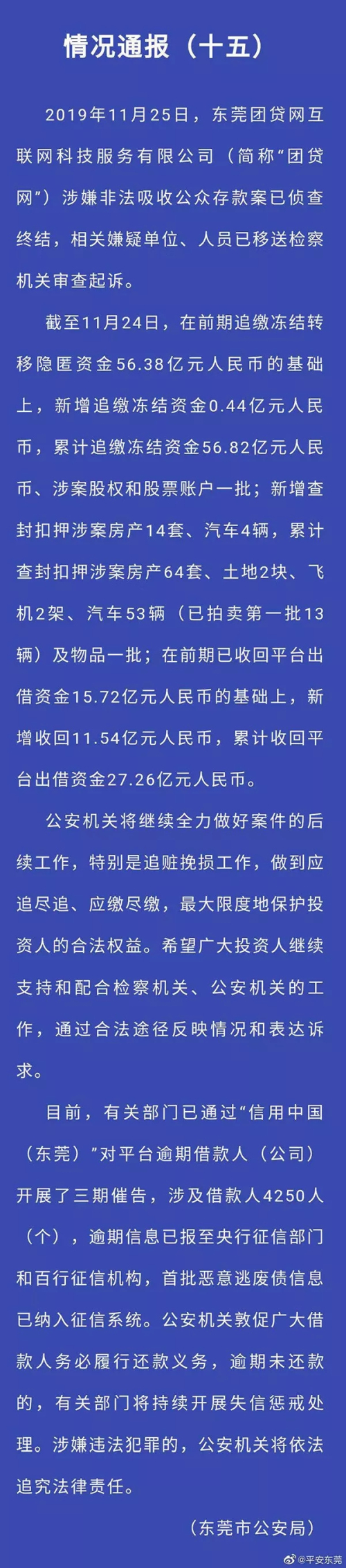 2019年11月25日,东莞公安局发布团贷网案情通报。通报称,2019年11月25日,东莞团贷网互联网科技服务有限公司(简称“团贷网”)涉嫌非法吸收公众存款案已侦查终结,相关嫌疑单位、人员已移送检察机关审查起诉。