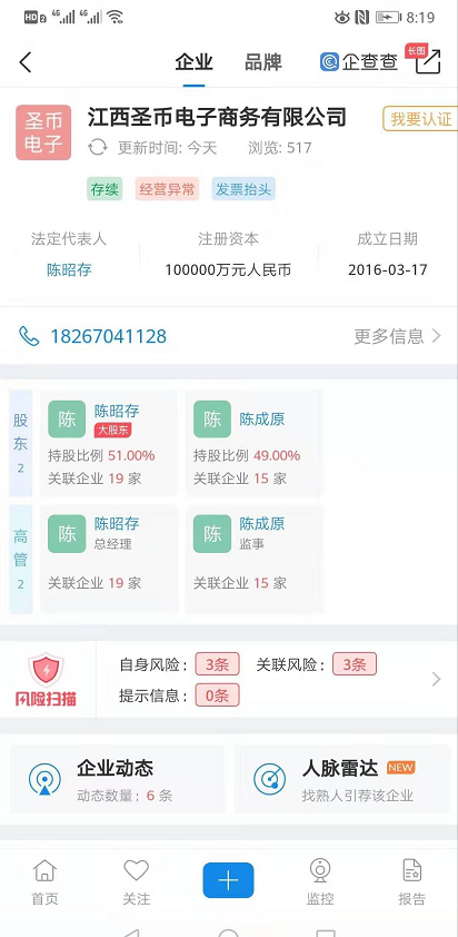 而湖北创购商品交易服务有限公司前身为浙江创购网络科技有限公司,目前该公司已经被列入经营异常名录。而根据其公开表示在2018年公司集团董事长为陈成原,创购商品董事长为陈有成,集团总裁为陈航进,小编在不断的了解下这是迁出了整个家族。而在今年5月其公司的身份又变了。董事长为陈有成,陈航进成了浪创集团的总裁,这里又出现了一家新加坡的公司执行主席,陈述理,执行董事变成了陈成原。