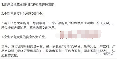 投资人最低需要5票原始票认购,购买后原始票会有锁仓期两个月,两到三个月纯收益20%到35%不等,一年可以翻2-3倍利润空间。故此,湖北创购商品交易服务有限公司宣传“赚钱轻松,可以足不出户即可赚钱”、“原始票稳赚不赔,本金有保障,利润有保障”。非凡产经网了解到,上一个原始票的持有者需要退出,必须靠新入者来接盘。