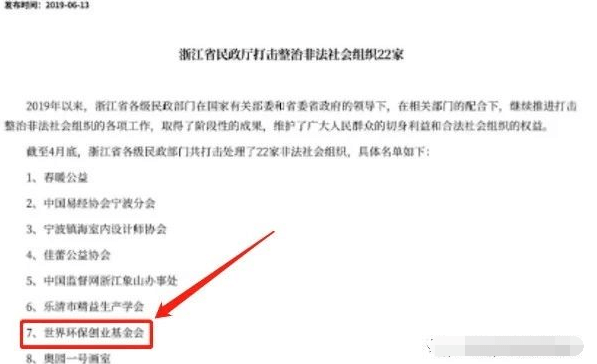 不过,今年6月,浙江省民政厅将世界环保创业基金会列入了非法社会组织名单。