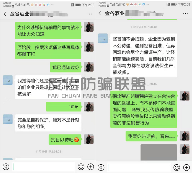 当反传防骗联盟坚哥问及承德金谷酒业负责人“为何公司涉及原始股、多层次返佣、涉嫌传销骗局等一系列行为不能让大众知道”时,该负责人称其只是在“自我保护”