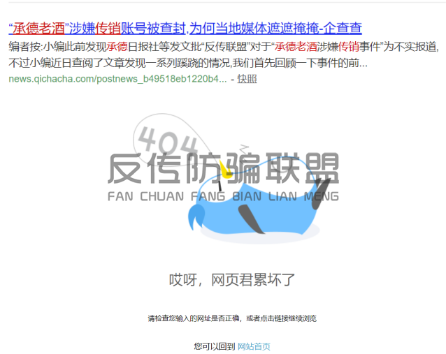 今天当小编再次打开上图中的《“承德老酒”涉嫌传销帐号被查封,为何当地媒体遮遮掩掩》一文时,已无法打开网页,显示的是404页面。