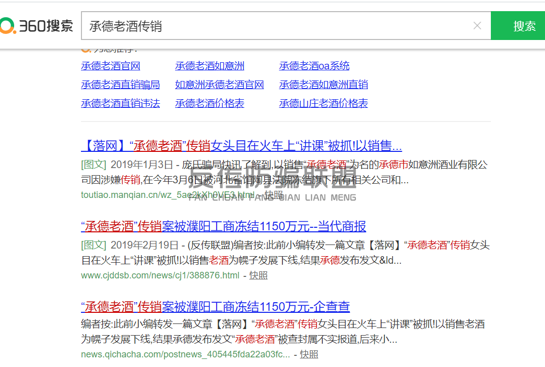 无独有偶,如意酒业的承德老酒与金谷酒业在处理自身问题的态度上如出一辙,先是出官方通告坚称“承德老酒”不属于非法传销范畴,后又聘用网络黑公关屏蔽相关负面消息。