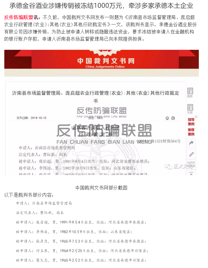 该裁判书显示,承德金谷酒业股份有限公司因涉嫌传销,为防止被申请人转移或隐匿违法资金,要求冻结被申请人在金融机构的银行账户存款,申请人沂南县市场监督管理局已向本院提供担保。