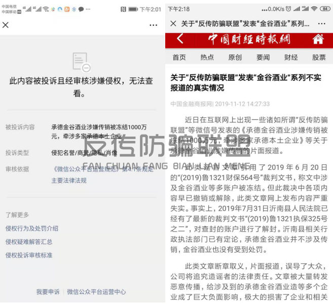 然而事与愿违,承德金谷酒业并未意识到自身的不足,在删贴上依然没有罢休,在辱骂删贴未果后,金谷酒业请来网络黑公关,欲倚靠黑公关攻击本网,不仅发文攻击本网报道不实,更是利用网络黑公关将反传防骗联盟公众号的《承德金谷酒业涉嫌传销被冻结1000万元,牵涉多家承德本土企业》一文投诉屏蔽并发布反传防骗联盟属诋毁其公司的舆论消息,如下:
