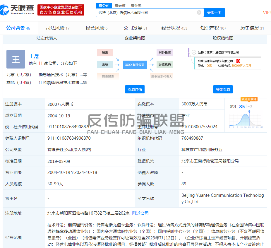 通过天眼查可以看到:远特(北京)通信技术有限公司成立于2004年10月19日,是中国的一站式通信服务提供商。注册地址位于北京市朝阳区酒仙桥路10号28号楼二层202室,注册资本3000万,公司法人代表是王磊。