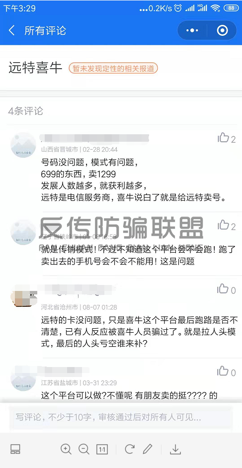 在灵鲲金融风险查询举报中心也有不少人留言质疑远特喜牛通信的收益模式。