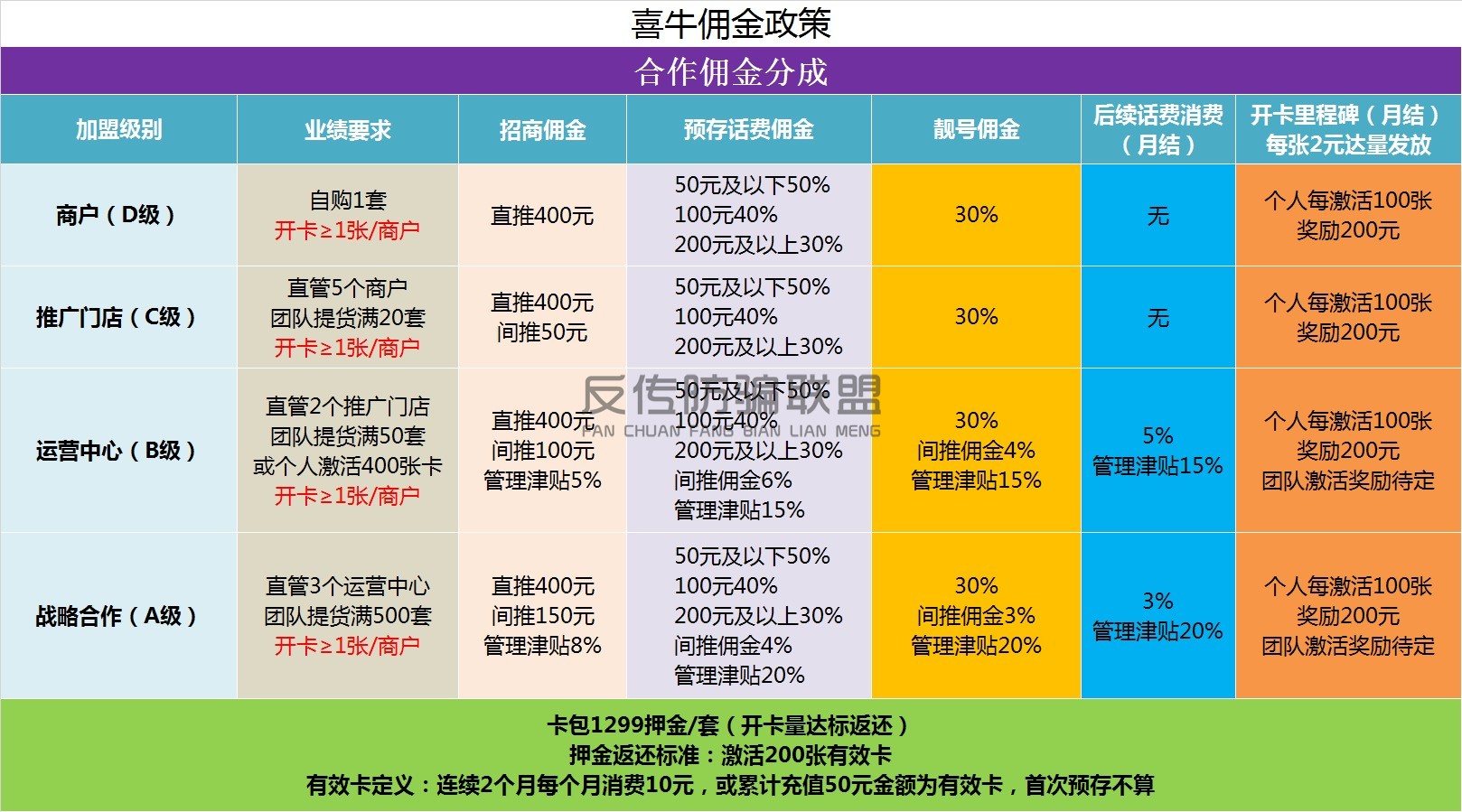 AB级除直推外还可享受团队每一个代理开出去的卡预存话费百分之6的