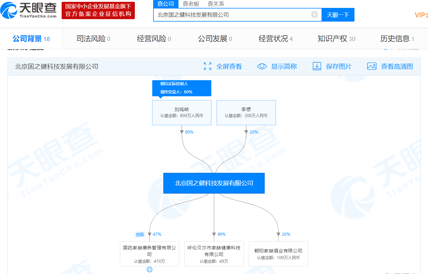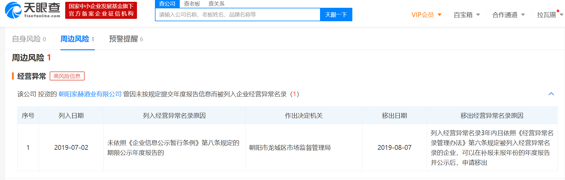 本网通过天眼查发现,北京国之健法定代表人是刘鸣岐,该公司投资朝阳家赫酒业有限公司曾因未按规定提交年度报告信息而被列入企业经营异常名录。