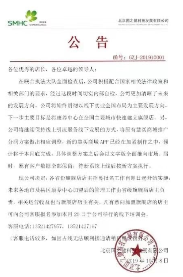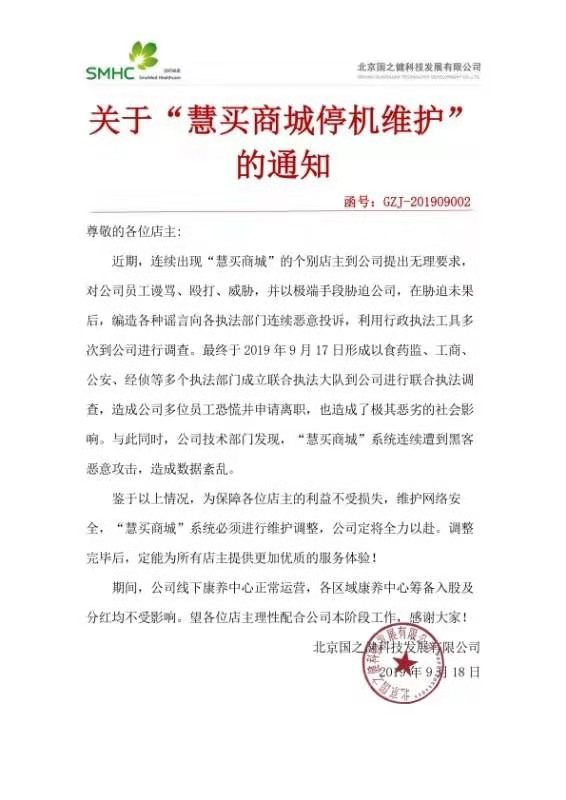 本网发现,今年9月18日,北京国之健公司发布“慧买商城停机维护”的通知,通知显示,北京国之健公司遭到个别店主提出的无理要求以及恶意投诉,导致9月17日形成了食药监、工商、公安、经侦等多个执法部门成立执法大队对公司进行调查,同时,北京国之健公司“慧买商城”遭到黑客攻击,造成数据絮乱。