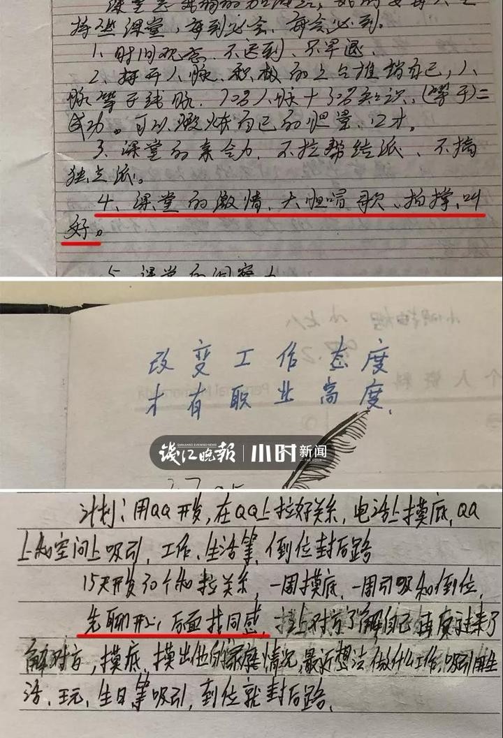 从警方查获的“学习笔记”上,看到课堂内容不仅有“课堂的激情,大胆唱歌、拍掌、叫好”等课堂纪律类的培训,也有“先聊开心,后面找同感”等诈骗技术类的教唆,甚至还有“改变工作态度,才有职业高度”这样的“励志”语录。