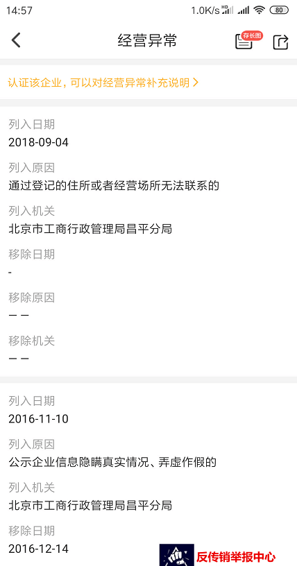 据查该公司被工商部门列入异常无疑。