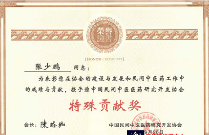 公司法人张少鹏喜提中国民间中医医药研究开发协会特殊贡献奖。
