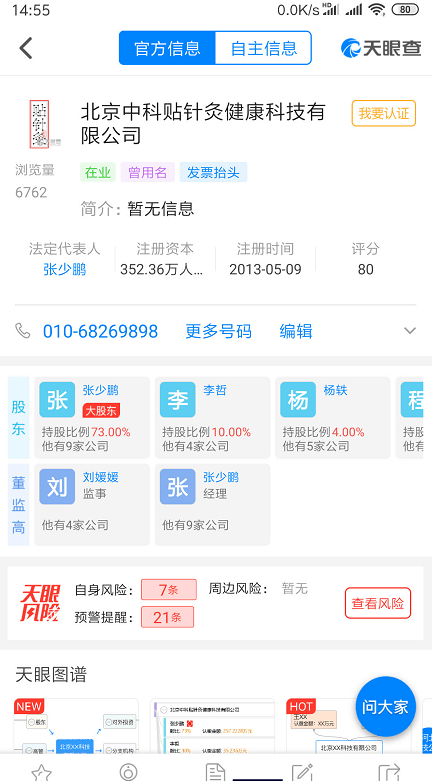 叫嚣“派几个弟兄上门探望父母”的“北京贴针灸”全称北京中科贴针灸健康科技有限公司(以下简称贴针灸)。