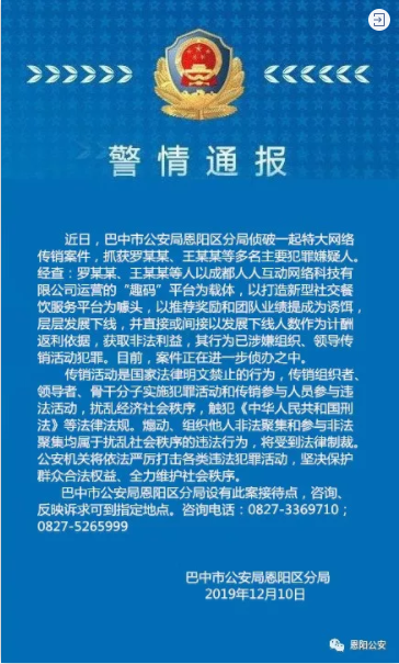 恩阳公安12月10日发布消息:近日巴中市公安局恩阳区分局通报该局破获的一起特大网络传销案。该局的警情通报显示,近日,巴中市公安局恩阳区分局侦破一起“趣码”特大网络传销案件,抓获罗川雄、王龙路等多名主要犯罪嫌疑人。