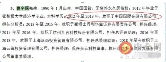 这位曹宇琛年纪虽小,但来头挺大,2012年毕业于密歇根大学经济学专业,随后加入中国国际金融有限公司,担任分析员!这操作是否违规?对于如此重大问题,光云科技IPO招股书竟然只字没提?