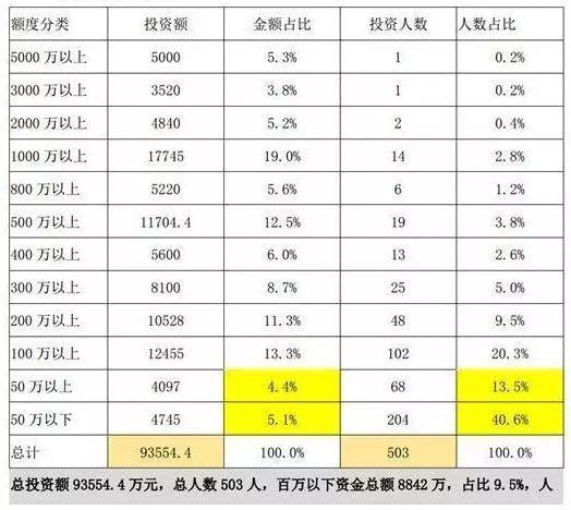 据证券时报报道,根据《投委会与秦鹏见面会议纪要》显示,牵涉其中的投资人总共有503个,总投资金额高达9.4亿元。其中,投资1000万元以上的有18人,50万元以下的有204人,占投资人总数的40.6%;大部分投资人的出资金额介于50万元至1000万元之间。