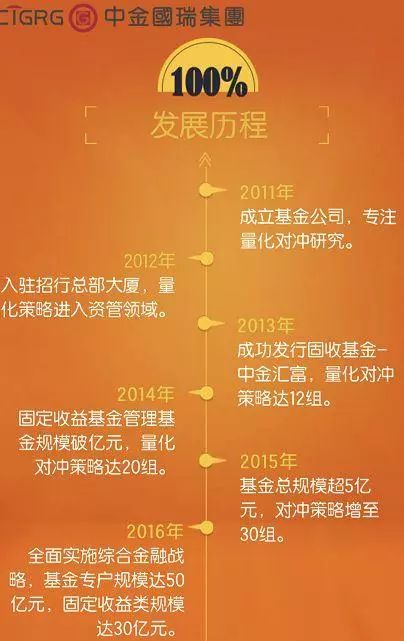 中金国瑞集团的官微介绍也显示,公司在2011年成立基金公司,专注量化对冲研究,2013年发行固收基金-中金汇富,2014年固定收益基金规模破亿元,2015年基金总规模超5亿元,2016年全面实施综合金融战略,基金专户规模达到50亿元,固定收益类规模达30亿元。