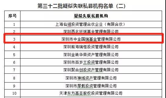 昨晚,中国证券投资基金业协会公布了第32批疑似失联私募机构,其中涉及一家名叫深圳市中金国瑞基金管理有限公司的私募,在今年发生9亿多资金无法兑付,涉及500多名投资者,引发市场关注。