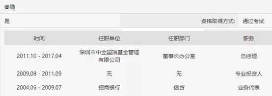 公开资料显示,中金国瑞基金的法定代表人、董事长秦鹏,曾经在2004年6月到2009年7月在招商银行任信贷业务代表,随后自己干过几年专业投资人,2011年成立了中金国瑞基金。
