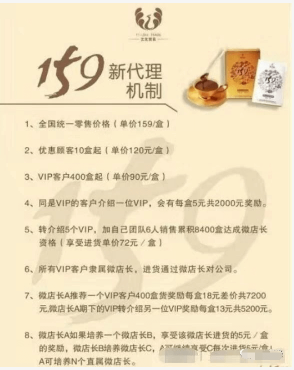 此前就有不少媒体质疑佐丹力健康产业集团(吉林)有限公司涉嫌传销。据了解,佐丹力159全国统一零售价为159元/盒、优惠顾客单价120元/盒,做VIP代理需要一次性投入3.6万,购进4000盒产品,单价90元/盒,同是VIP的客户介绍一位VIP,会有每盒5元共2000元的奖励,转介绍5个VIP,销售累积8000盒达成微店长资格(享受进货单价72元/盒),微店长A如果培养一个微店长B,享受该微店长进货的10元/盒的奖励,所有VIP客户隶属微店长,进货通过微店长对公司。