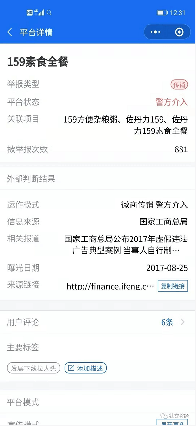 而另据灵鲲金融风险查询举报中心显示,“159素食全餐”处于异常状态,平台状态显示“警方介入”,举报类型为“传销”,被举报次881次,截止2019年12月20日。