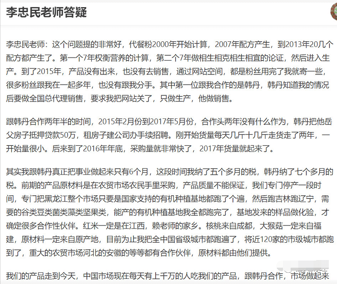 实际研发人是李忠民这一点,在一篇名为“李忠民老师答疑”的文章中也可以得出,李忠民如此回应相关问题,“到了2015年,(素食代餐粉)产品没有出来,也没有去销售,通过网站空间,都是粉丝用完了我就寄一些。其中第一位跟我合作的是韩丹,韩丹知道我的情况后要做全国总代理销售,要求我把网站关了,只做生产,他做销售。”