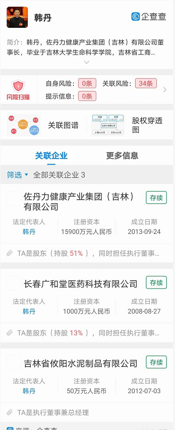 据了解,销售“佐丹力159素食全餐”产品的是一家名为佐丹力健康产业集团(吉林)有限公司的企业,该公司成立于2013年9月24日,曾用名吉林省佐丹力生物科技有限公司、长春佐丹力生物科技有限公司,公司注册资本1.59亿元,实缴0元,股东有法定代表人韩丹和张香云。