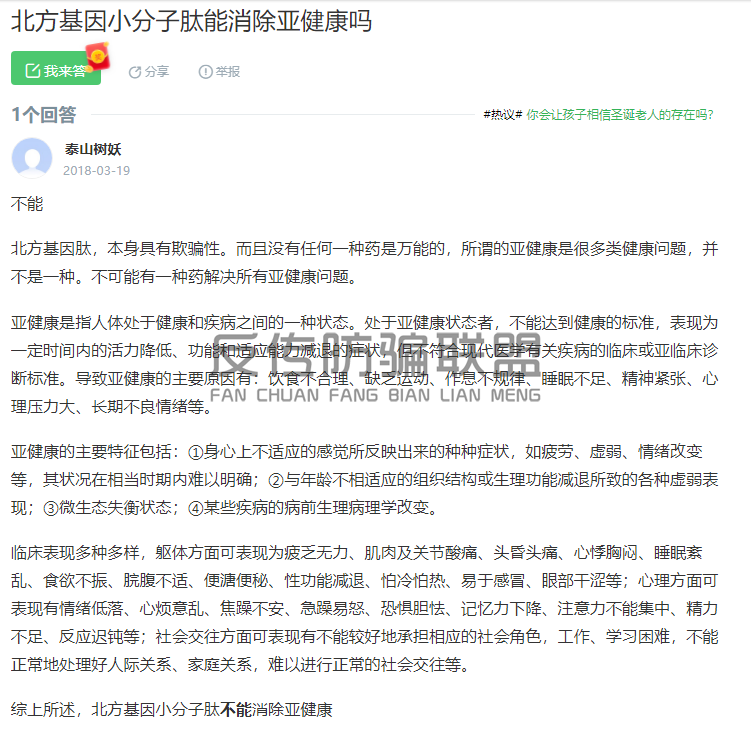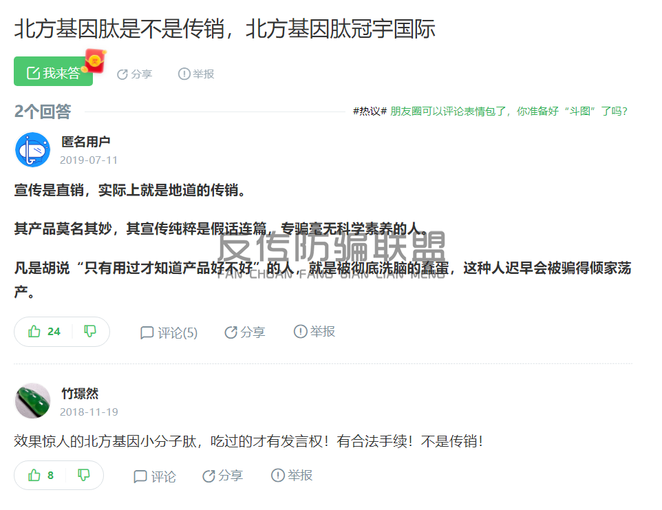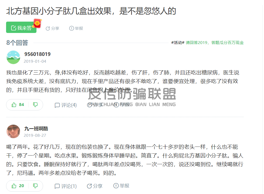 尽管互联网充斥着北方基因肽与苹果干细胞产品成功抗击各种疾病的案例,但是反传防骗联盟发现,不少网友今年留言咨询北京基因肽产品效果时,提出了许多质疑。