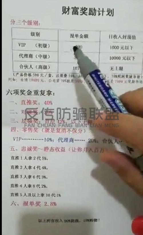 据中国质量新闻网报道,只要缴纳590元购买一盒产品就可以成为初级代理,再加100元就可以成为终身代理;只要缴纳3640元(6盒产品)就可以成为中级代理;缴纳10720元(18盒产品)就可以成为高级代理。