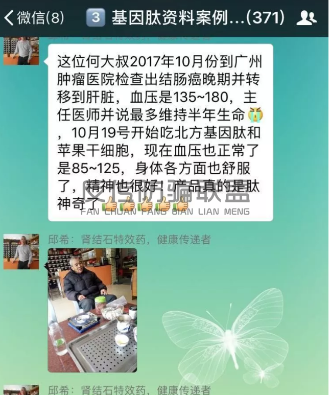 反传防骗联盟还发现,仍有不少代理商大肆宣传北方基因肽可以治疗癌症的成功案例。