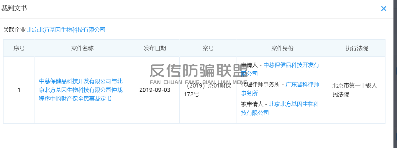 今年8月27日,北方基因肽曾委托代工生产产品的公司中慈保健品科技开发有限公司向北京仲裁委员会申请财产保全,请求查封、扣押或冻结北京北方基因生物科技有限公司价值6845656元的财产。9月2日,北京仲裁委员会将保全申请书等材料提交北京市第一中级人民法院。9月3日,北京第一中院裁定:查封、扣押或冻结了北京北方基因生物科技有限公司价值6845656的财产。与此同时进行的是,北京第一中院还查封、扣押或冻结了北京泰博吉信科技发展有限公司价值1300万元的财产。