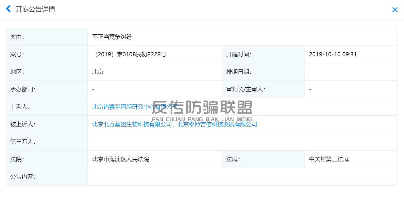 今年10月10日,据诺赛基因声明,就两公司上述违反商业道德,利用他人合法商誉为自己谋取非法利益的不正当竞争行为,诺赛基因已经向北京海淀区人民法院提起诉讼,海淀区人民法院已经受理该案。