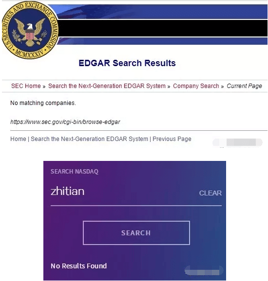 之前,声称智天的美国公司是“世界智天艺术金融有限公司”(World Zhitian Art Finance Co., Ltd),但在美国证监会(SEC.GOV)和纳斯达克官网(Nasdaq.com)上搜寻“zhitian”,均查不到任何信息!